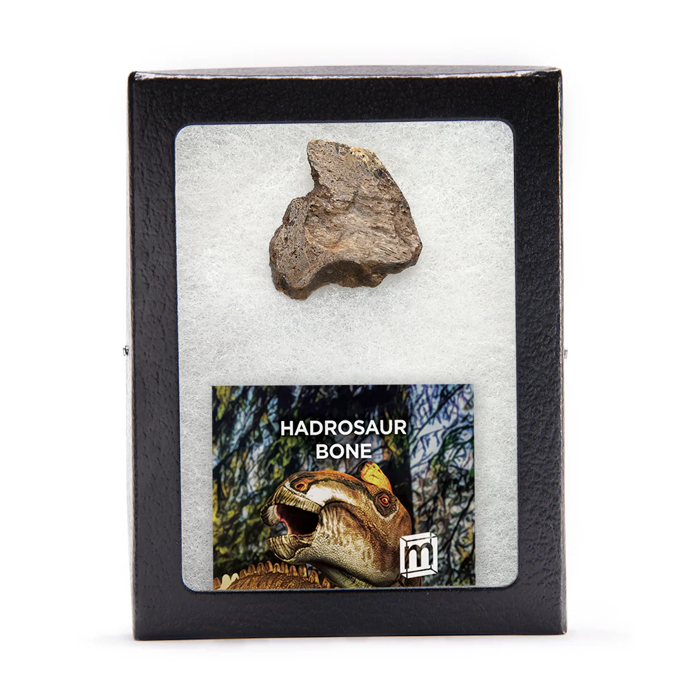 This specimen is a slice of Hadrosaur bone from an Edmontosaurus, recovered on private land in South Dakota from the Lance Formation. The specimen comes inside a classic, glass-topped riker display case measuring 4 1/2" x 3 1/2". A small information card is also enclosed.